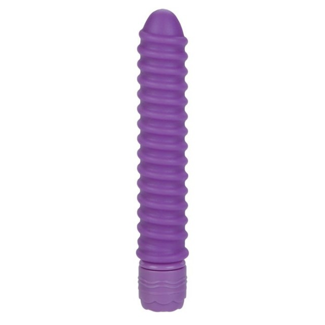 Вибратор из пластика с силиконовой оболочкой фиолетового цвета рельефной формы.