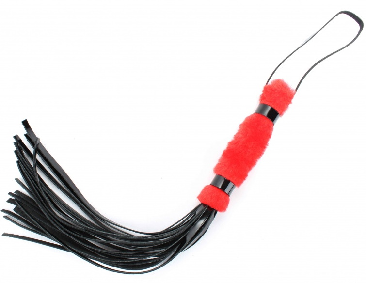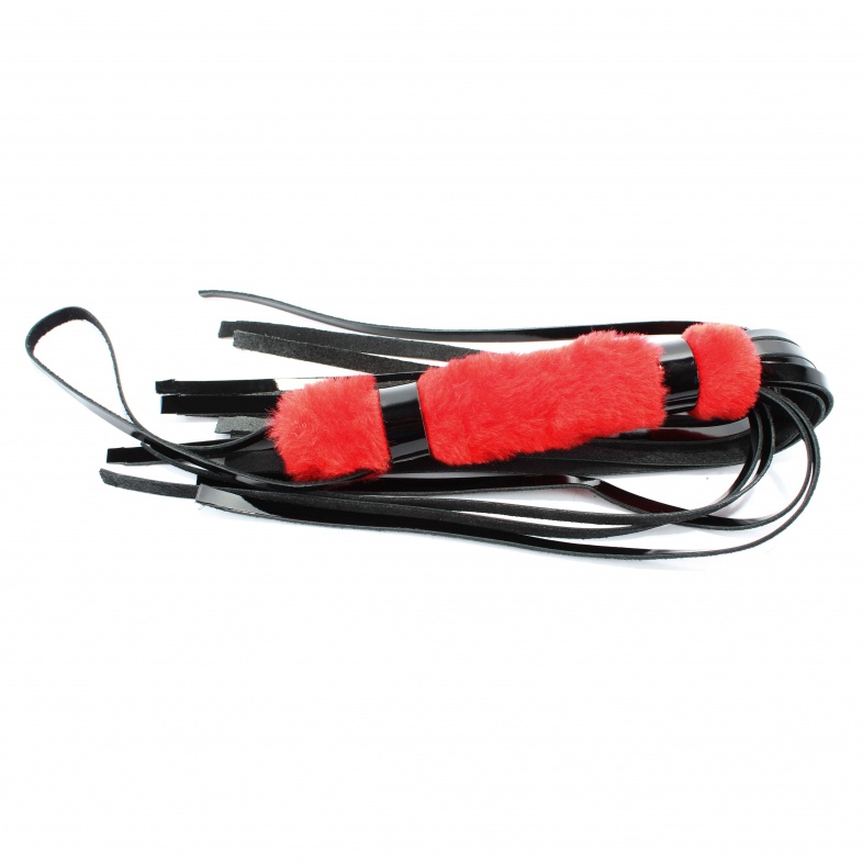 Плеть сочетает в себе рукоятку длиной 16 см. и диаметром 3 см. выполненную из эко-меха красного цвета, и хвосты длиной 28 см. из натуральной лакированной черной кожи. На конце рукоятки имеется петелька длиной 20см.