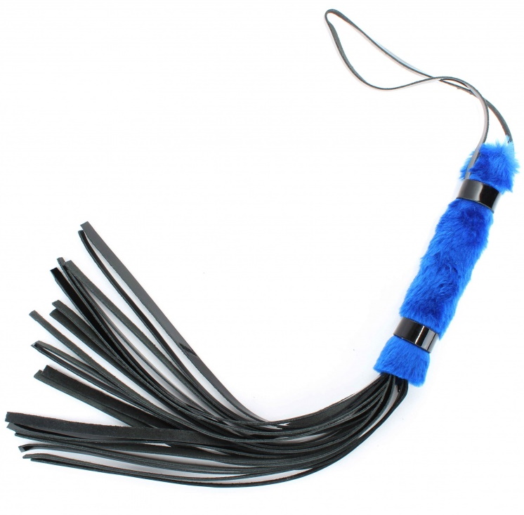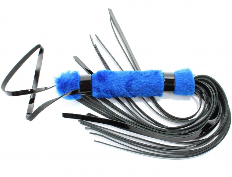 Плеть сочетает в себе рукоятку длиной 16 см. и диаметром 3 см. выполненную из эко-меха синего цвета, и хвосты длиной 28 см. из натуральной лакированной черной кожи. На конце рукоятки имеется петелька длиной 20см.