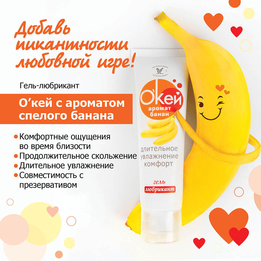 Гель любрикант О'кей с ароматом банана позволяет дополнить удовольствие от интимной близости любимым ароматом фрукта!