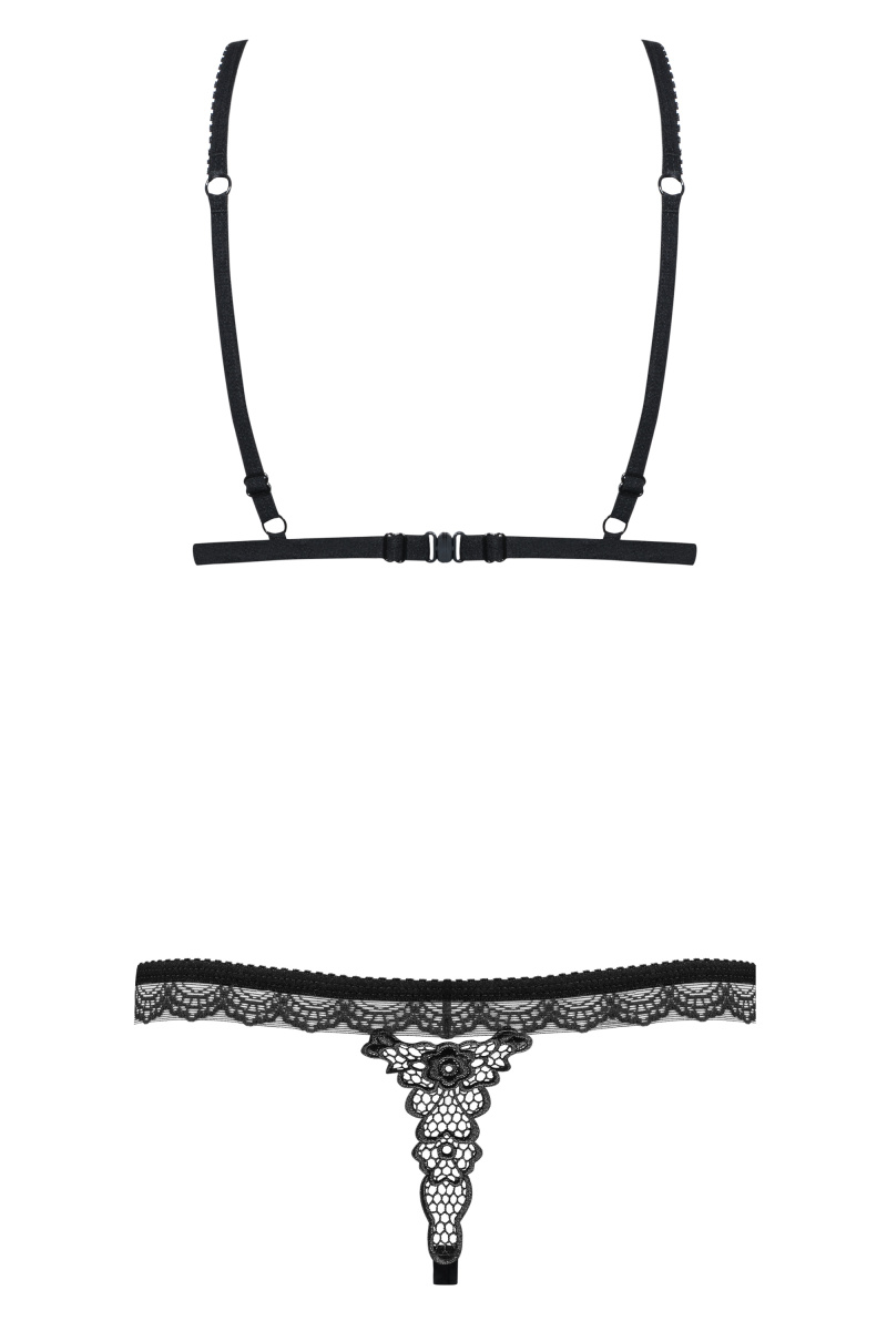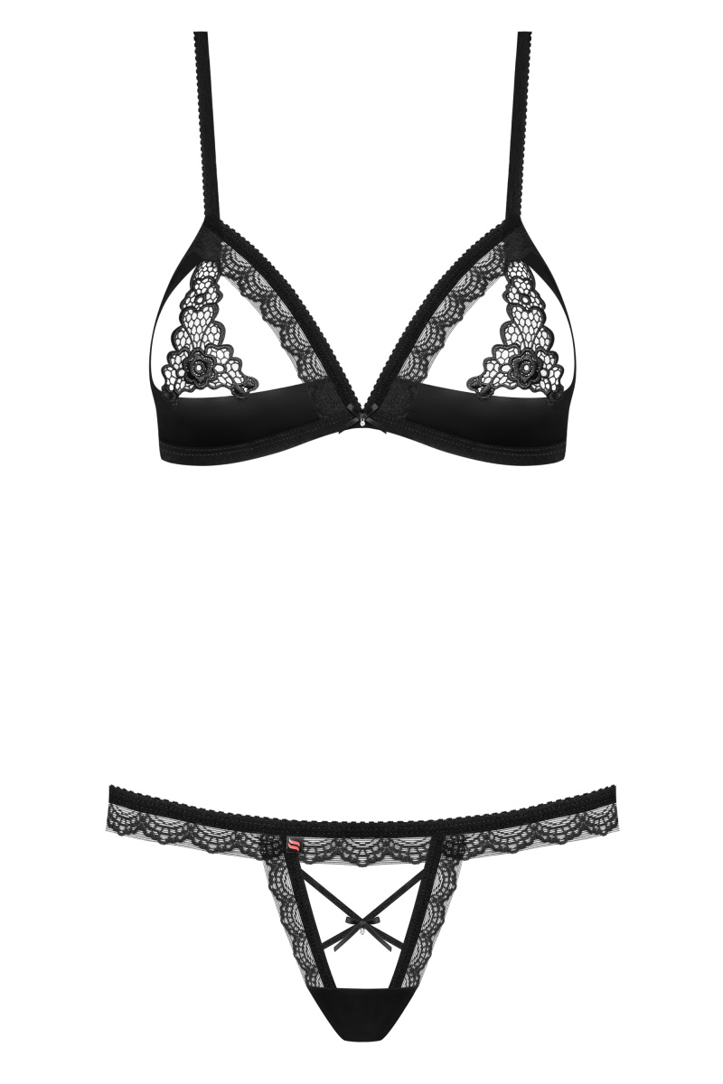Детали: бюстгальтер с регулируемыми бретелями и застежкой - гарантия идеальной посадки, открытые чашки с уникальной кружевной вставкой - потрясающий вид бюста, необычный дизайн стрингов - смелый крой и перекрещенные резинки спереди, красивое кружево сзади, комплект декорирован бантами и мелкими ювелирными украшениями, приятные на ощупь, эластичные, идеально облегающие ткани.