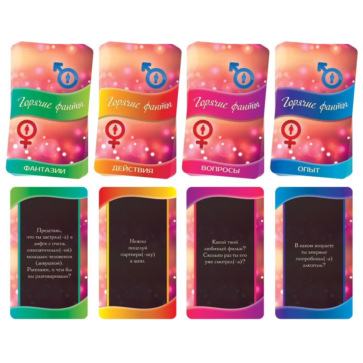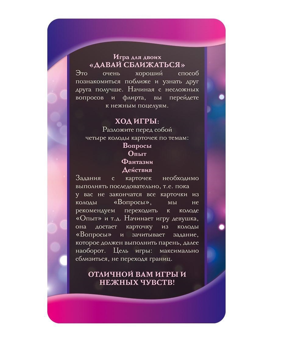 Перед вами четыре колоды карт. Выполняйте все задания последовательно, пока в каждой колоде не закончатся фанты! Отвечайте на вопросы, делитесь опытом и фантазиями, а затем переходите к более решительным действиям. Вытягивайте карточки и ловите каждое мгновение, ведь это так важно — узнавать друг друга в самом начале отношений.
