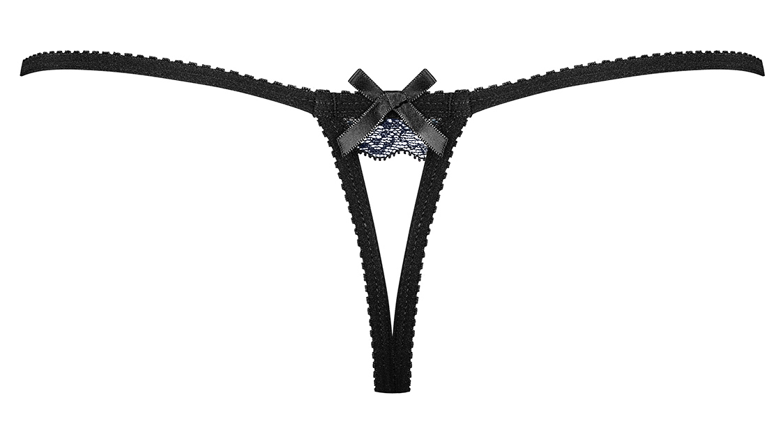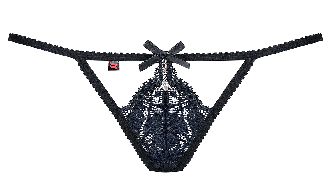 Детали: игривые и очень милые стринги, нежные полоски сексуально оплетают тело, темно-синее кружево соблазнительного кроя, кокетливый бант и бижутерия спереди - элегантное украшение, пикантный вырез на ягодицах, бантик и добавление черного кружева, эластичные, идеально облегающие ткани.