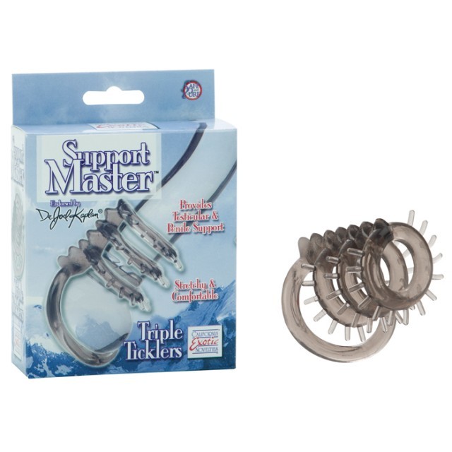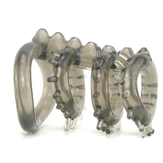 Дымчатый хомут на пенис из тянущегося и упругого материала. Все 4 кольца одеваются на пенис, через большее продевается мошонка, а три стимулирующих кольца на стволе пениса предназначены для поддержки эрекции и дополнительной стимуляции партнерши.