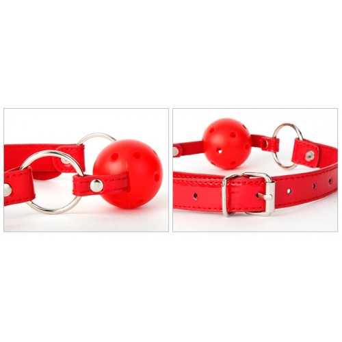Дышащий кляп изготовлен из прочного пластика, он полностью заполняет рот, а специальные дырочки облегчают дыхание и обеспечивают полный комфорт во время использования. Кляп крепится к ремешку с помощью двух металлических колец и клепок.