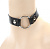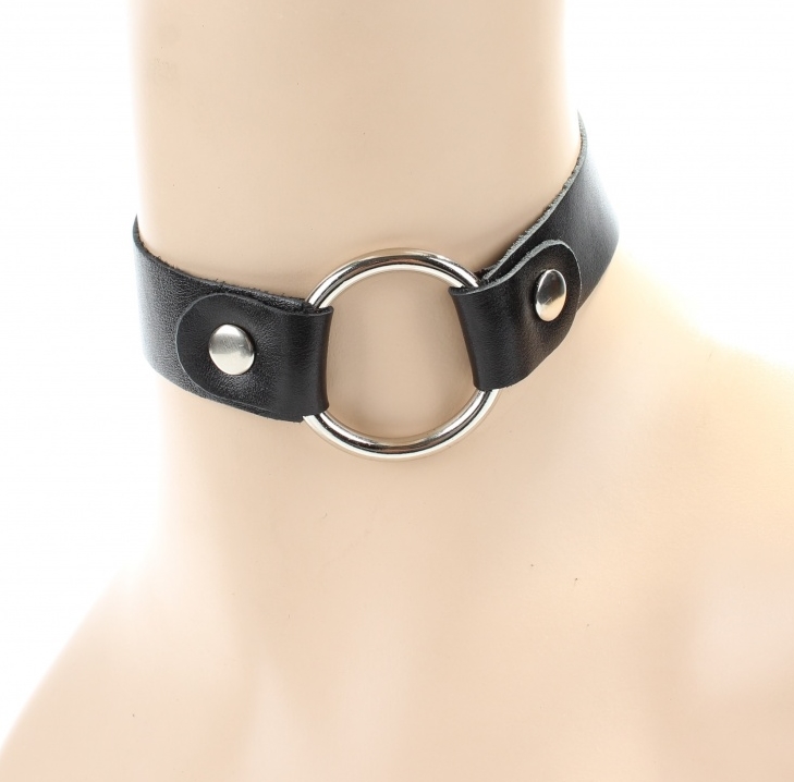 Ширина ремешка 2см. Впереди металлическое кольцо диаметром 3,5см, размер чокера удобно регулируется пряжкой сзади, максимальный обхват 45см.