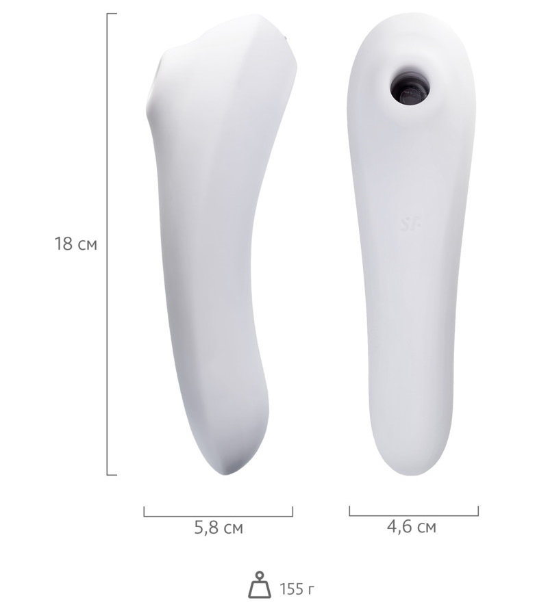 Кончик стимулятора плотно прилегает к клитору и обеспечивает вакуумно-волновое воздействие, а его другая сторона отлично создает чувственную вибрацию и благодаря изогнутой форме подходит для стимуляции зоны G.
