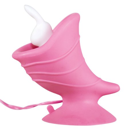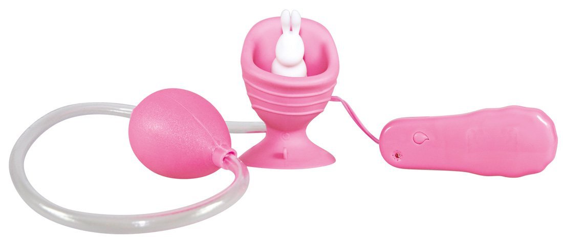 розовая вакуумная чашечка для клитора с насосом-грушей для откачки воздуха и белым вибрирующим зайчиком,