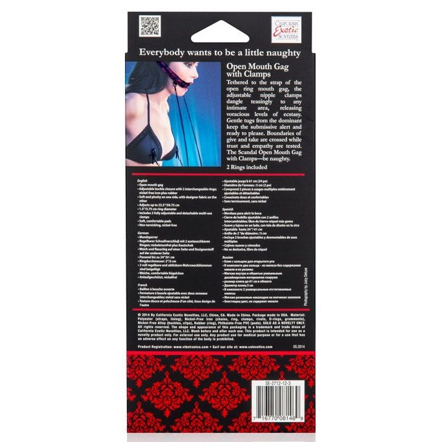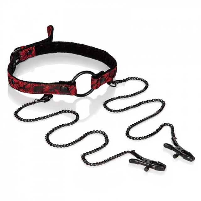 Красивый и стильный ремень-кляп с кольцом (2 штуки в комплекте - одно металлическое, другое из мягкого материала) в наборе с зажимами для сосков на черных тяжелых цепочках. Степень давления на соски регулируется с помощью металлических рычажков, на кончиках клипс резиновые накладочки, чтобы не повредить кожу.
