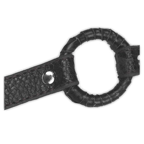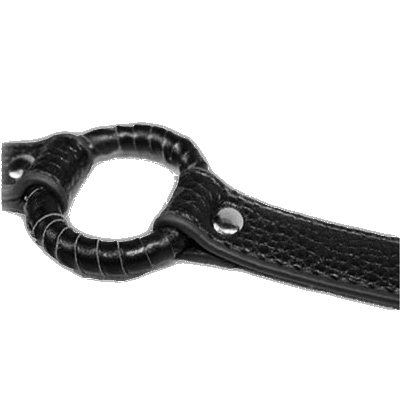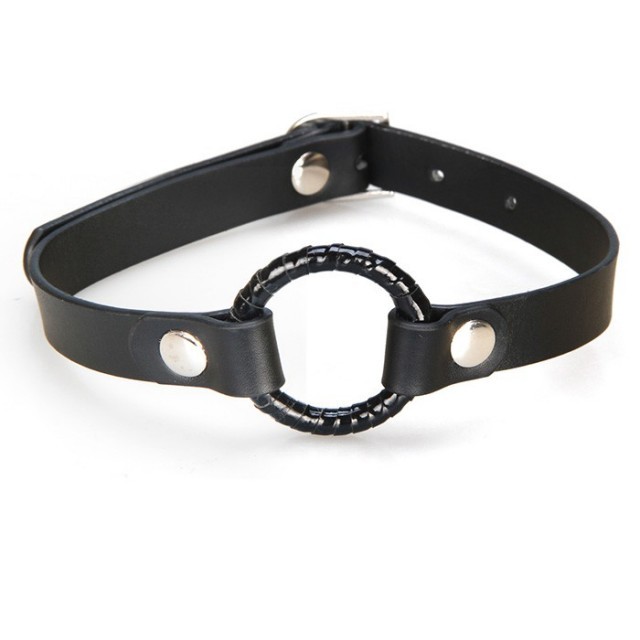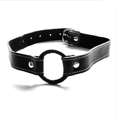 Черный кляп в виде кольца на регулируемом ремешке из искусственной кожи.
