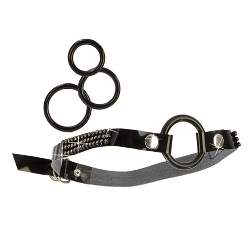 Гламурный девайс из винила с кристаллами, черного глянцевого цвета, со сменными кольцами для языка, с внутренним диаметром от 2,8 см до 4,3 см.