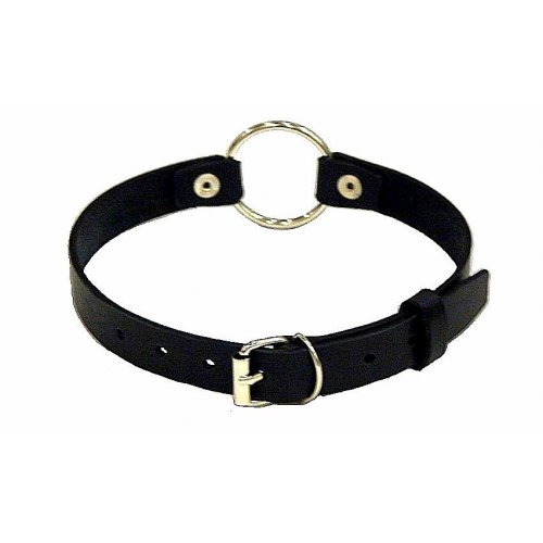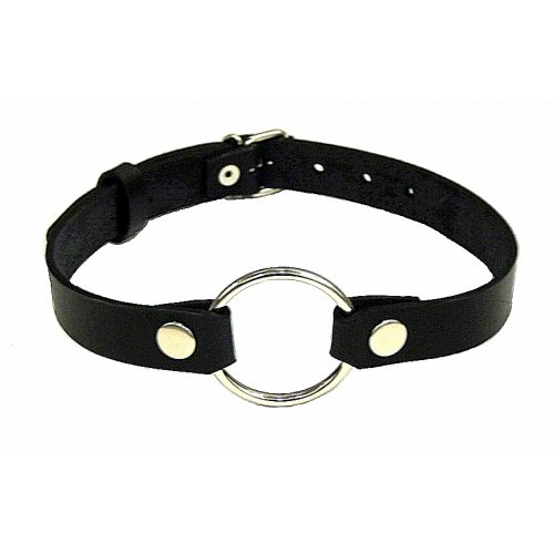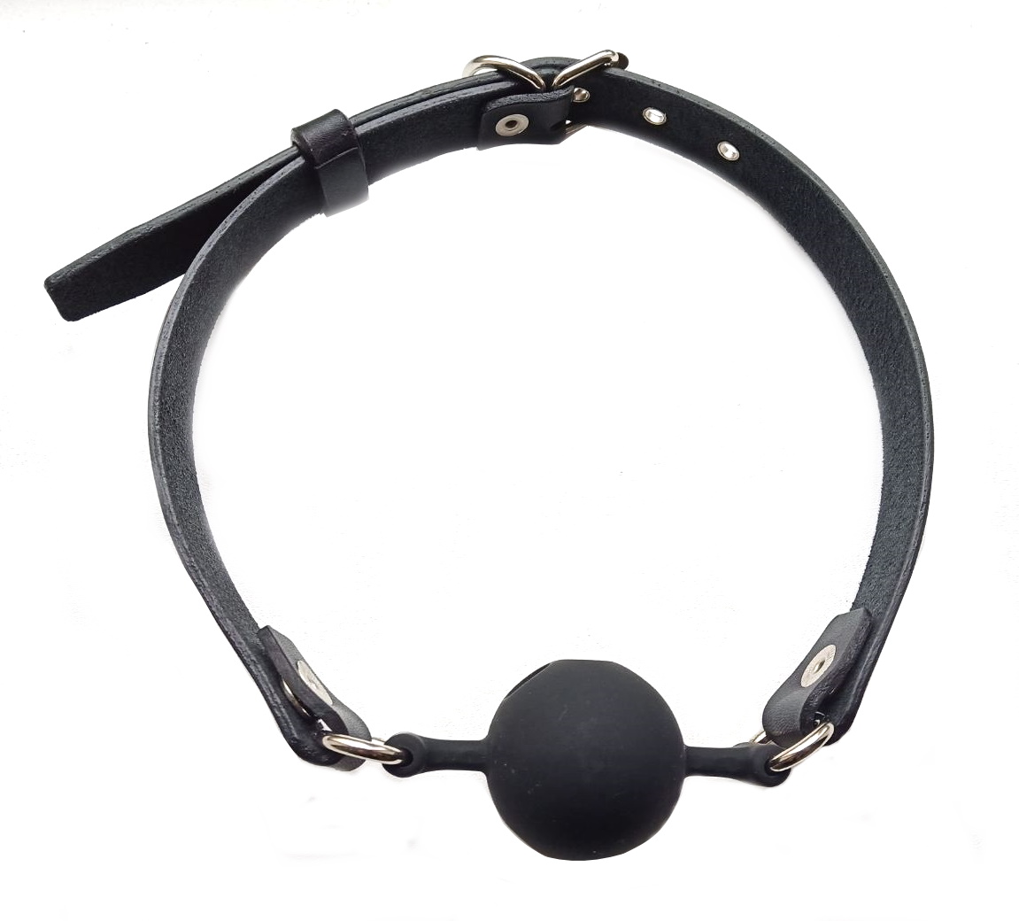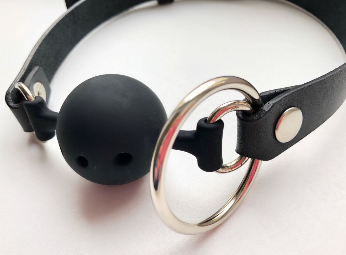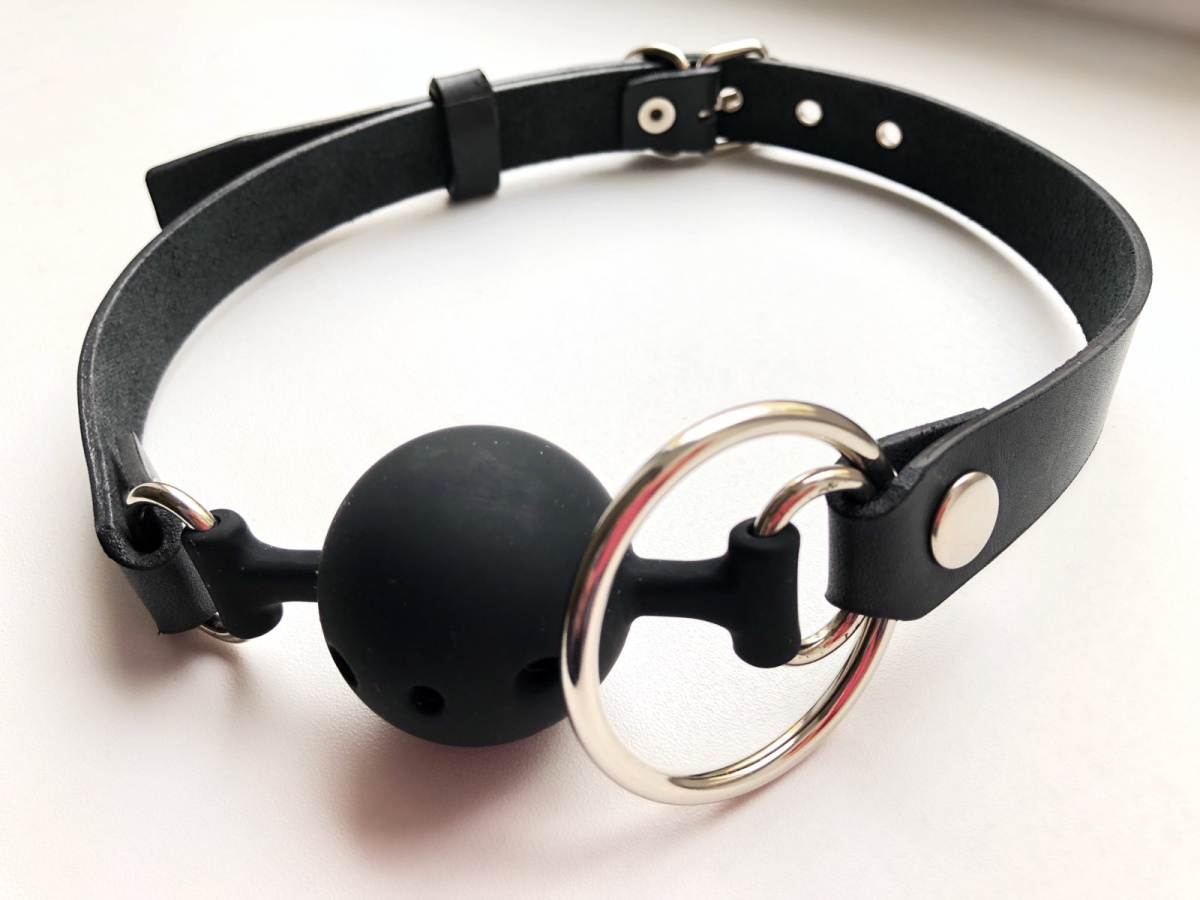 Кольцо держится на кожаных ремешках, которые крепятся на затылке, фиксируя кляп.