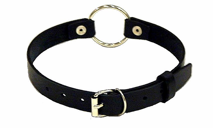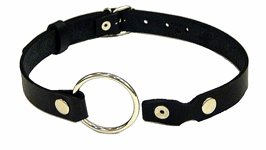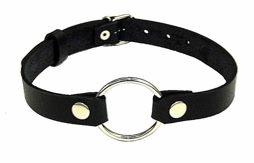 Кольцо держится на кожаных ремешках, которые крепятся на затылке, фиксируя кляп.