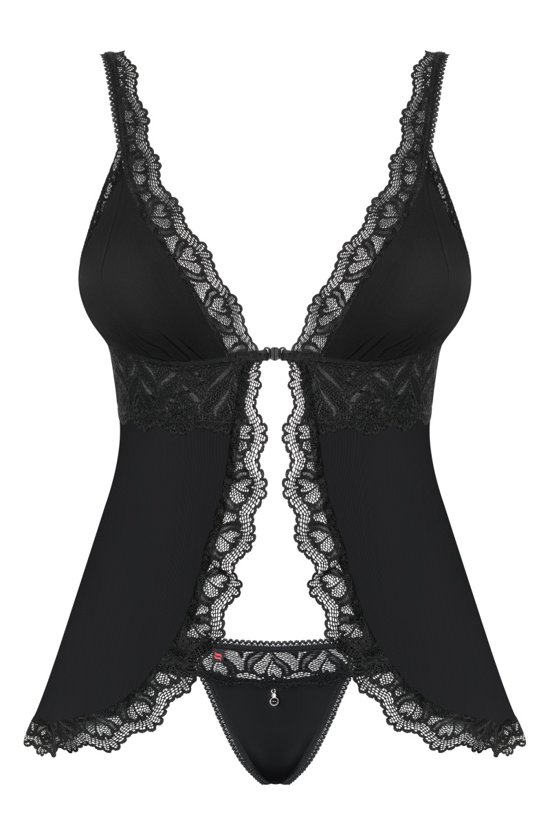 Детали: выполнен из мягкой ткани с кружевной отделкой, регулируемые бретели обеспечивают идеальную посадку, удобная застежка на груди, резинка под грудью визуально приподнимает грудь, кружевная полоска под бюстом - милое украшение, края обработанные кружевом, стринги с кружевной полосой кокетливо дополнят бэби-долл, блестящий орнамент на трусиках, эластичная, облегающая ткань Multistretch.