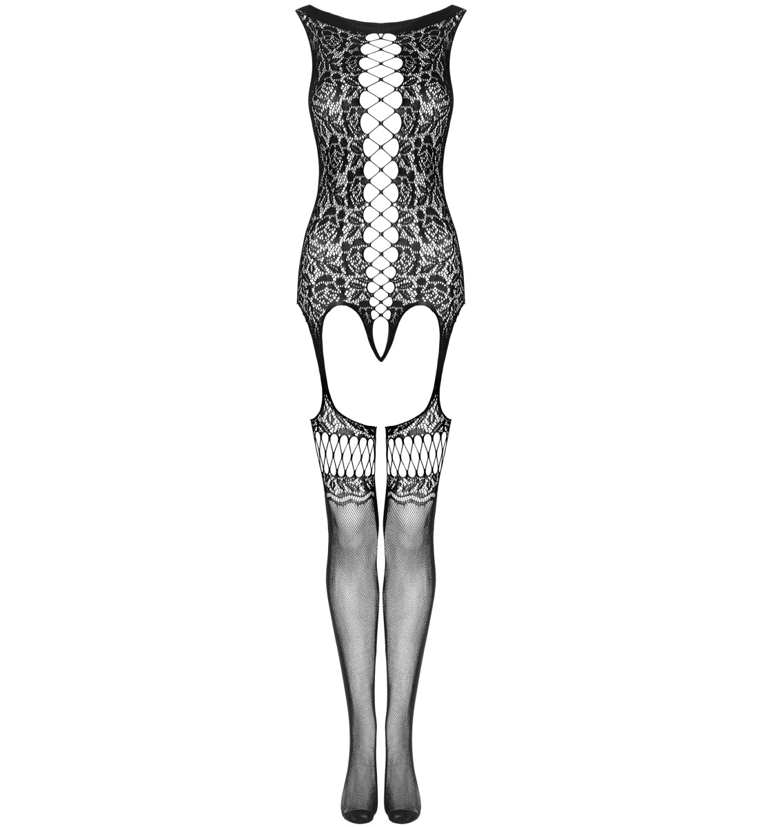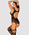 Боди соединяется с чулочками в мелкую сетку лаконичными пажами.