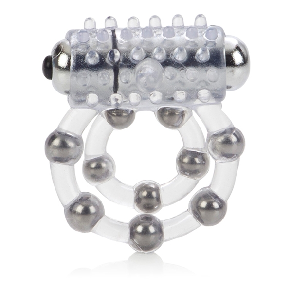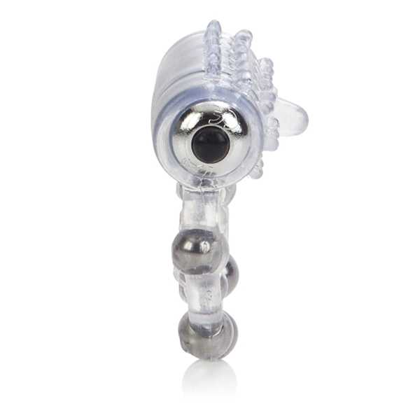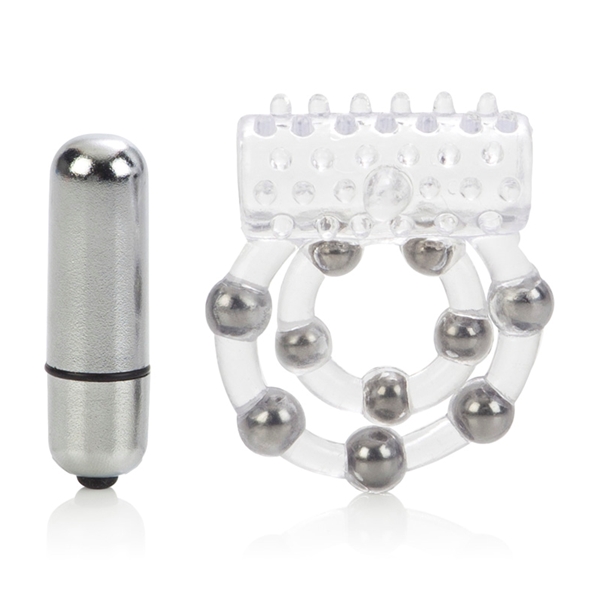 Прозрачное упругое колечко для максимальной эрекции Вашего друга и стимуляцией клитора для Вас! Кольцо на пенис с 5 металлическими шариками, есть петля для мошонки также с металлическими шариками внутри. Чехольчик для вибро-элемена покрыт выпуклыми точками.