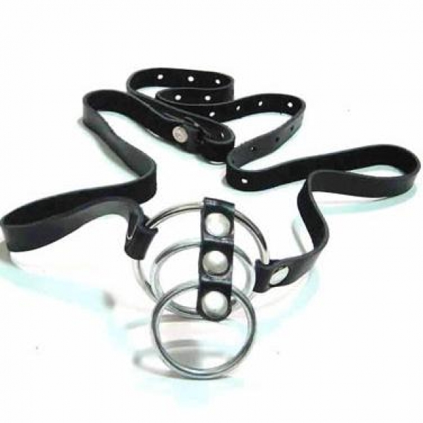 Фиксатор на пенис с тремя металлическими кольцами и кожаным ремешком. Регулируемые ремни.