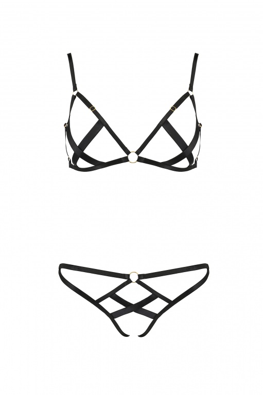 Комплект состоит из открытого лифа и контактных трусиков. На спинке лифа - удобная застежка.
