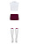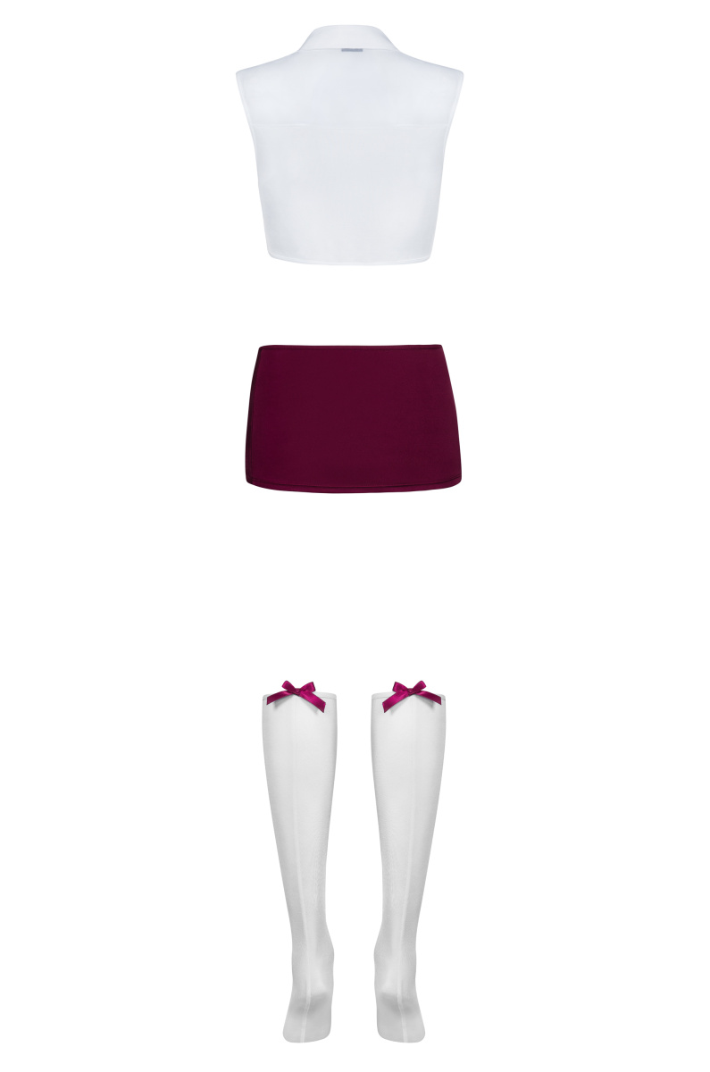 Костюм состоит из коротенькой бордовой юбочки, которая открывает соблазнительные ножки и делает акцент на бедрах. Верх представлен белым укороченным топом с полупрозрачными вставками, который привлекает все внимание к вашей груди. Комплект дополняют белые гетры с бордовыми бантиками и бордовые стринги, которые делают весь комплект более пикантным!