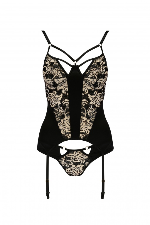 Сексуальный чёрный корсет с золотой вставкой. Прозрачный деликатный тюль и кружево. Трусики выполнены из кружева и тюля. Ремешки регулируемые. Используется специальная резинка, как в бюстгальтерах.