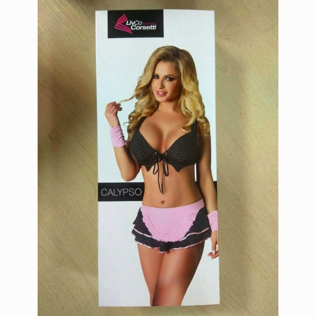 Сексуальный костюм горничной Calypso состоит из лифа, юбочки, трусиков и нарукавников.