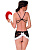 Комплект состоит из ночной сорочки, которая сделана из кружевной ткани, черных стринг и белых манжетов.