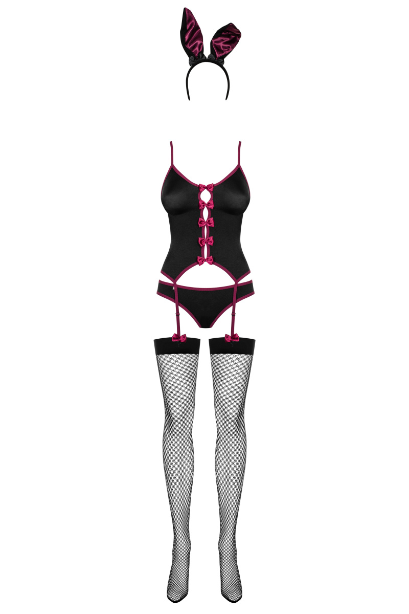 В комплект входят: корсет, трусики, чулки и повязка на голову с ушками.