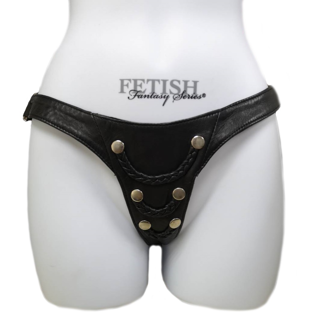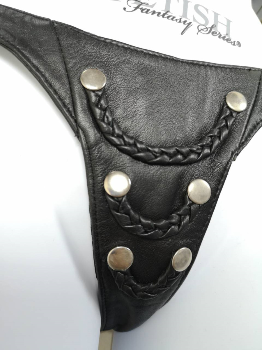 Кожаные трусики-танга с атласной подкладкой с декором из металлических клепок.