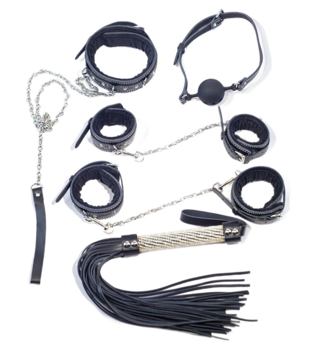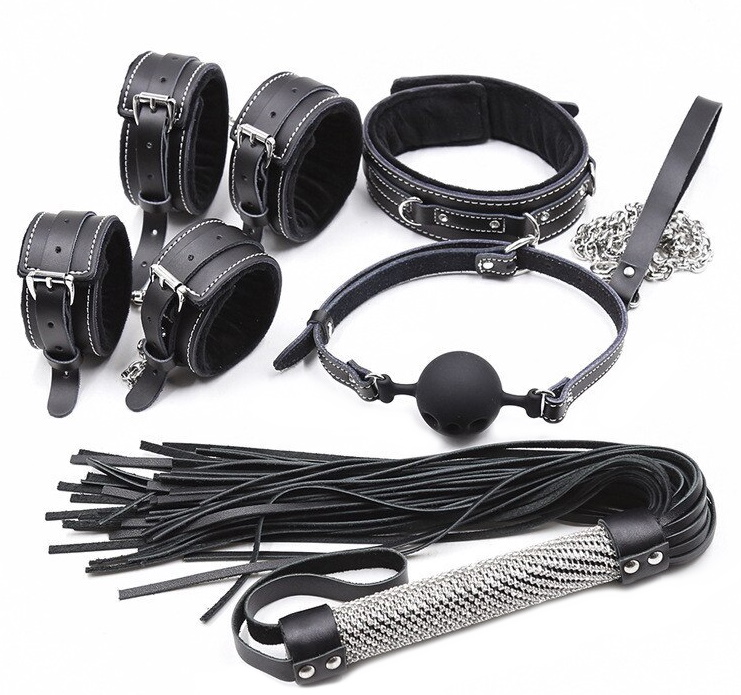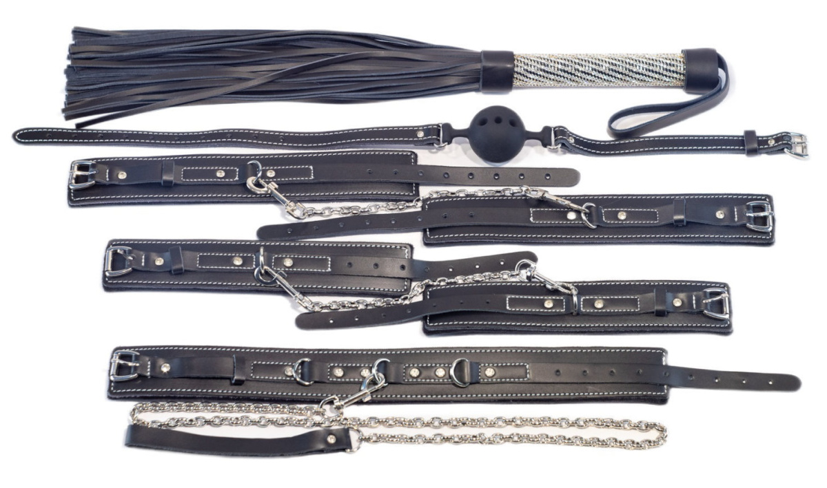 В набор входят: наручники, поножи, плеть, кляп, ошейник и поводок.