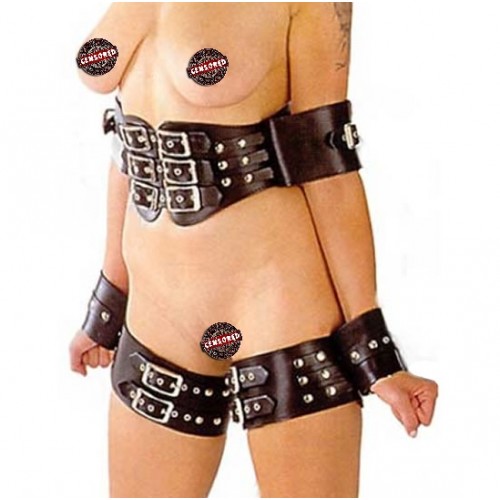 БДСМ бондаж изготовлен из кожи чёрного цвета. Состоит из бондажного мини корсета с фиксаторами для локтей и соединённых фиксаторов для рук и бёдер.