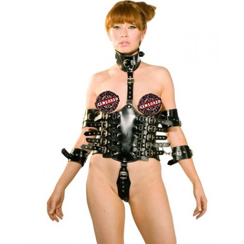 На спине имеется по 4 ремешка, расположенных вертикально, для регулирования размера. По бокам есть также 4 металлических кольца, к которым в двух местах крепятся наручники.