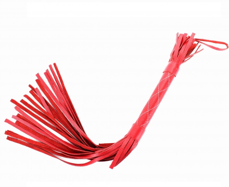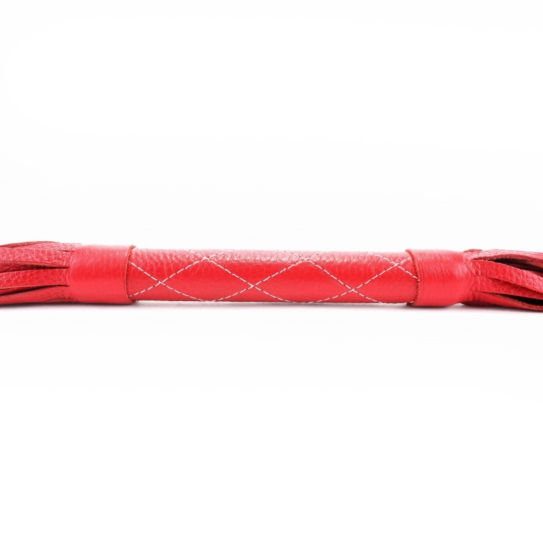 Плеть выполнена из натуральной кожи красного цвета, рукоятка декорирована прострочкой нитями.