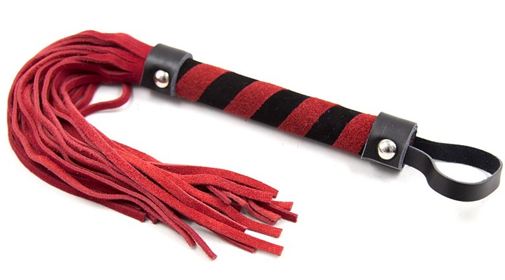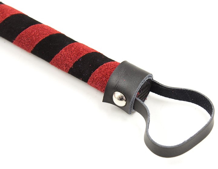 Сама плеть выполнена из замши, ручка украшена черно-красным спиральным узором. На конце имеется петелька для того, чтобы аксессуар не выпал из рук даже во время самых страстных игр!