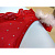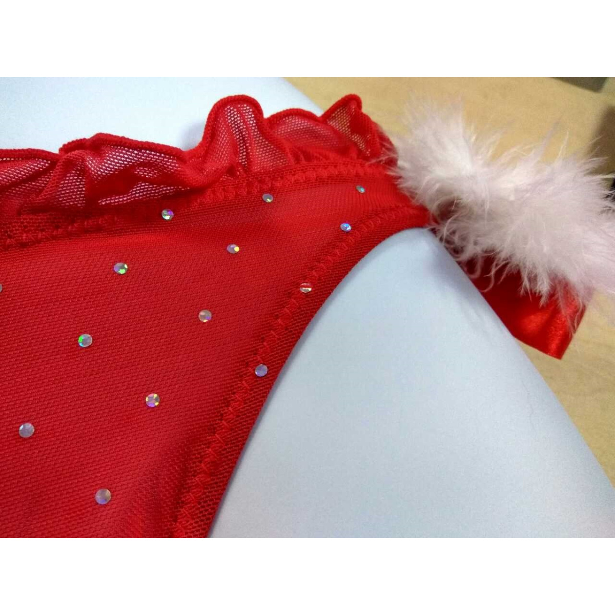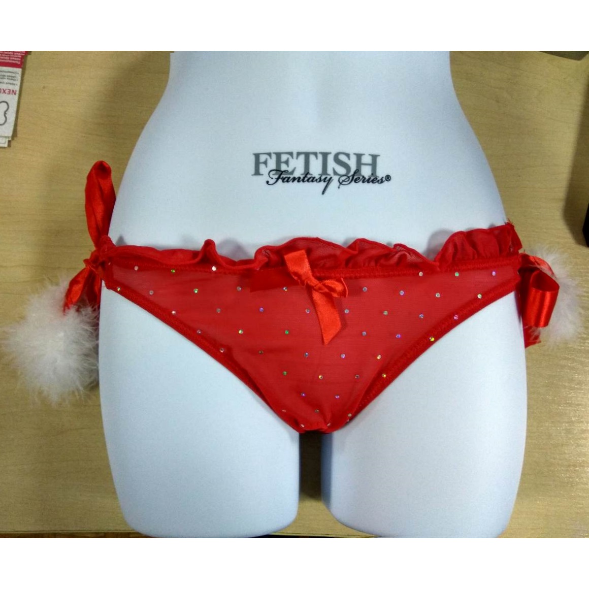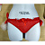 Красные сетчатые трусики в белый горох с белыми пушистыми помпонами на бантиках по бокам.