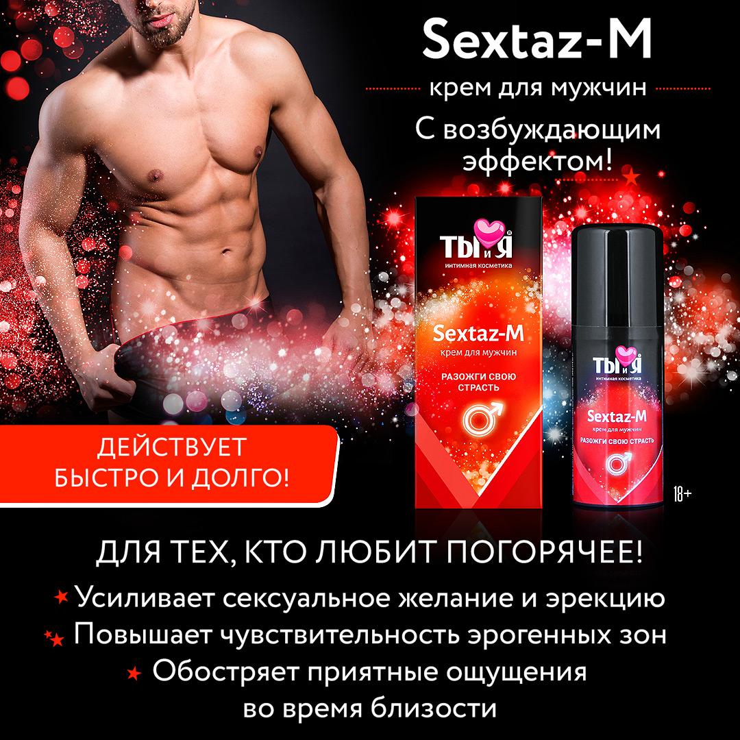 Действует быстро и продолжительно. Усиливает сексуальное желание и эрекцию. Улучшает кровенаполнение полового члена. Повышает чувствительность эрогенных зон. Обостряет приятные ощущения во время близости. Крем «Sextaz-M» мягко питает и увлажняет кожу.