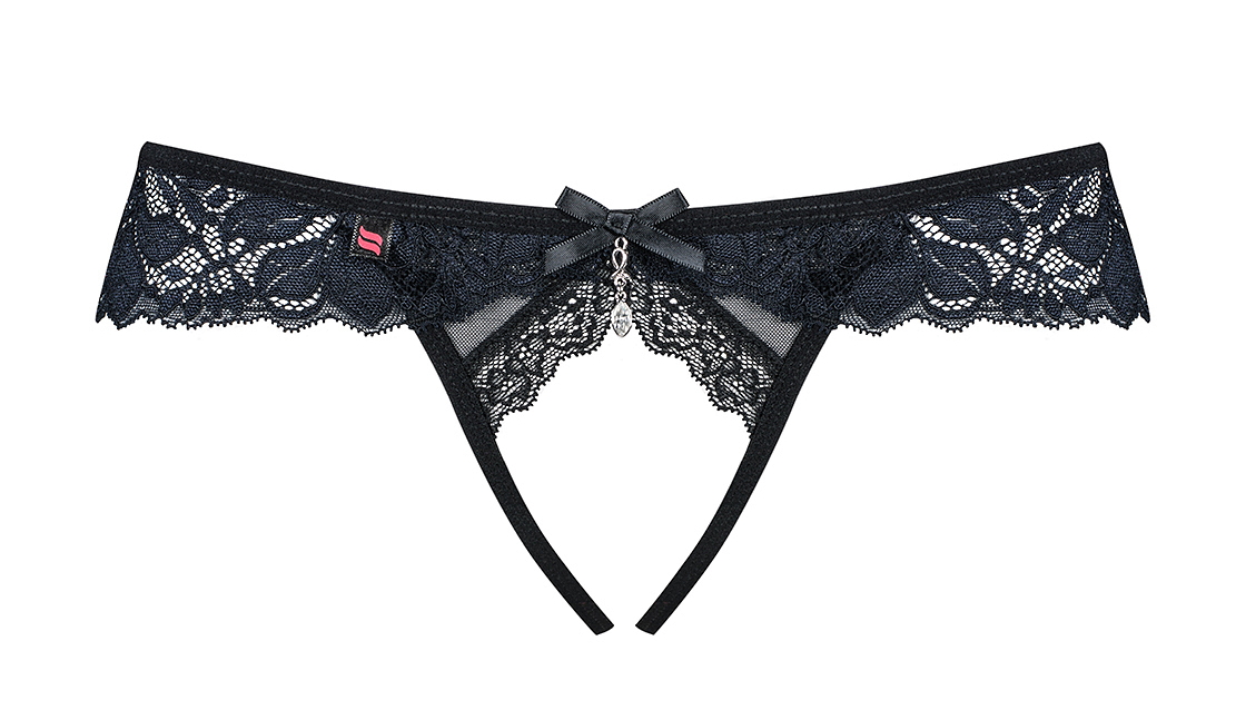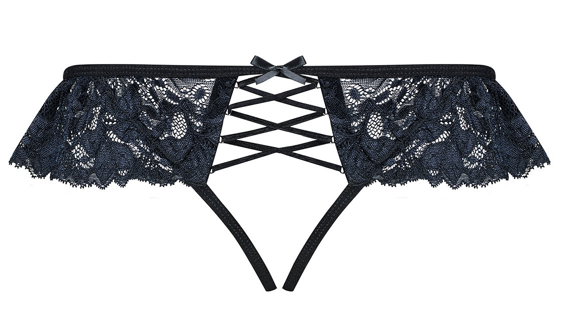 Детали: трусики чрезвычайно пикантного дизайна, пояс из темно-синего кружева с добавлением черного кружева - чувственное сочетание, открытая промежность - низ трусиков выполнен только из эластичных лямок - залог незабываемых ощущений, бант и подвеска спереди, бантик и скрещенные резинки на ягодицах - сексуальный вид, эластичные, идеально облегающие ткани.