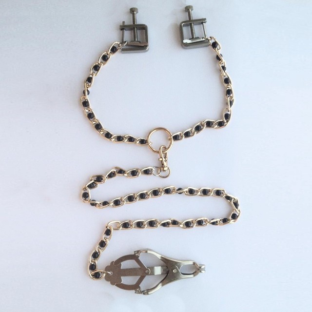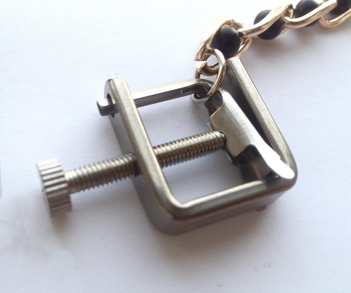 Конструкция зажимов, имеющая маленький карабин позволяет отцепить звено и использовать только для сосков или только для сдавливания и оттягивания половых губ!