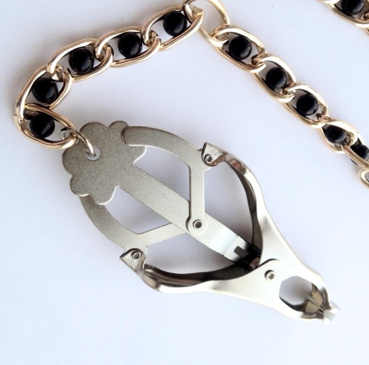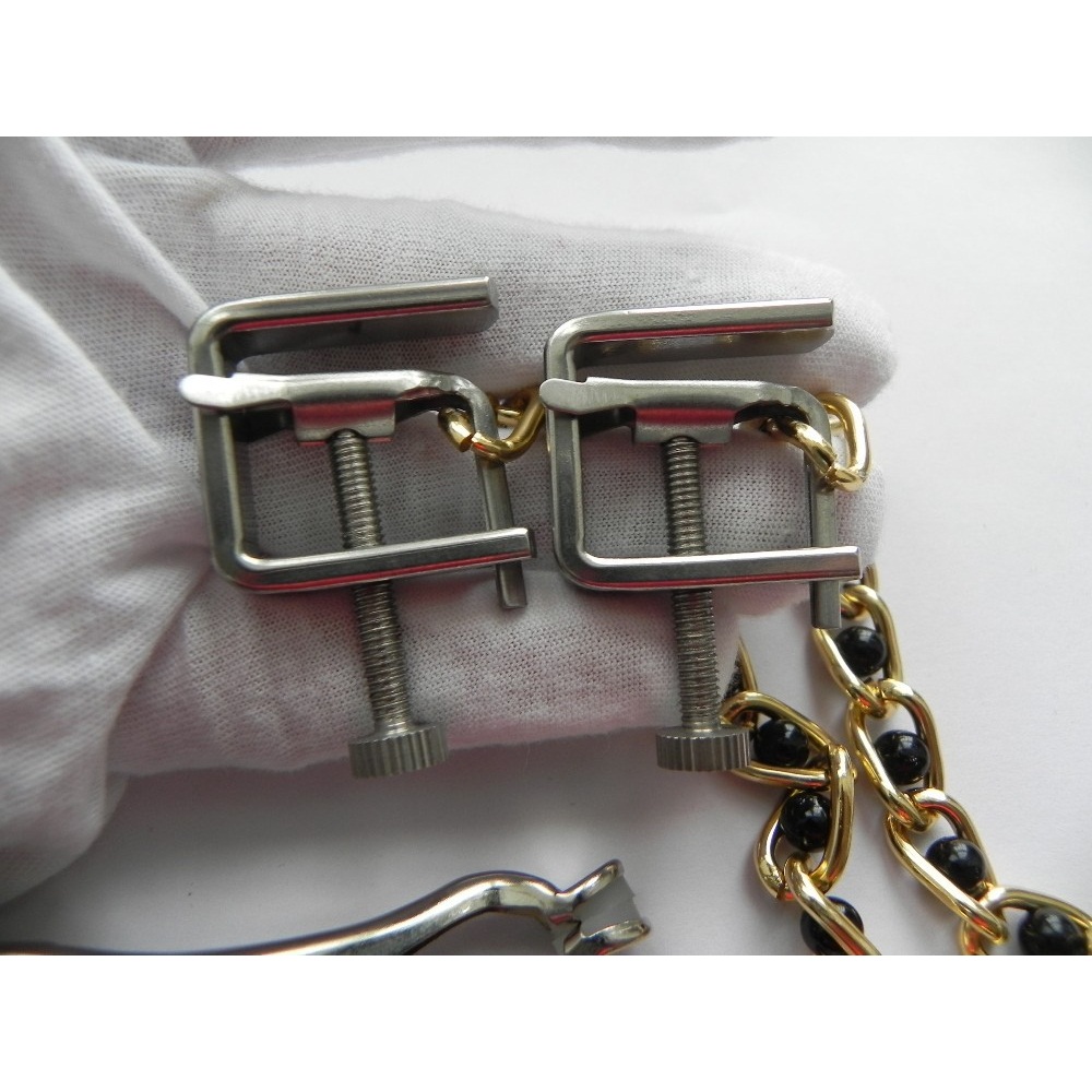 Зажимы на соски и клитор, соединенные цепочкой из золотистого металла с черными бусинками. Зажимы на соски регулируются по силе сжатия.