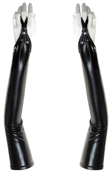 Перчатки длинные, выше локтя, прекрасно садятся и принимают форму руки, имеют универсальный размер. Также они будут прекрасно сочетаться с лакированным бельем, либо с любым другим комплектом черного цвета.