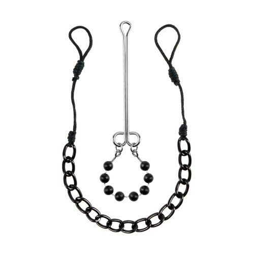 В комплект входят зажимы для половых губ, а также лассо для сосков соединенное цепочкой.