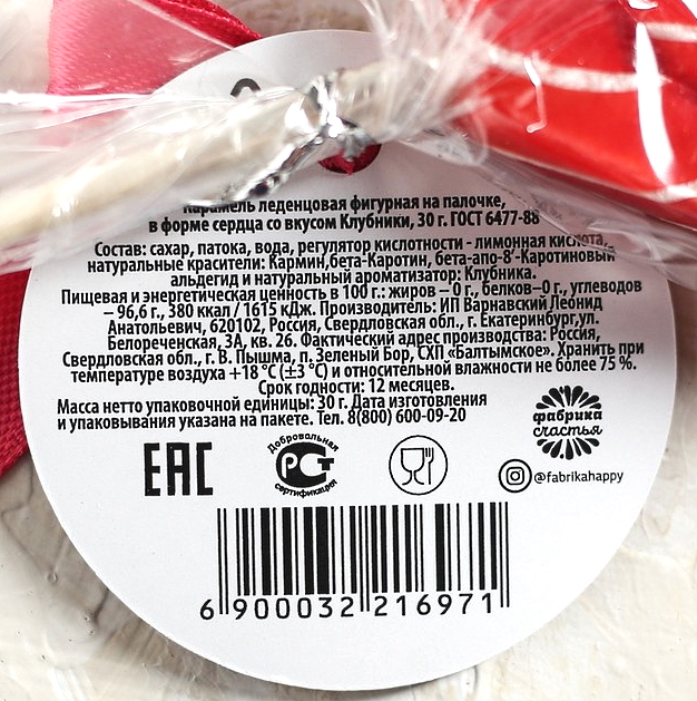 Состав: сахар, патока, вода, регулятор кислотности – лимонная кислота, натуральный ароматизатор в ассортименте, натуральные красители: кармин, Б-апокаротиновый альдегид, куркумин, Б-каротин
