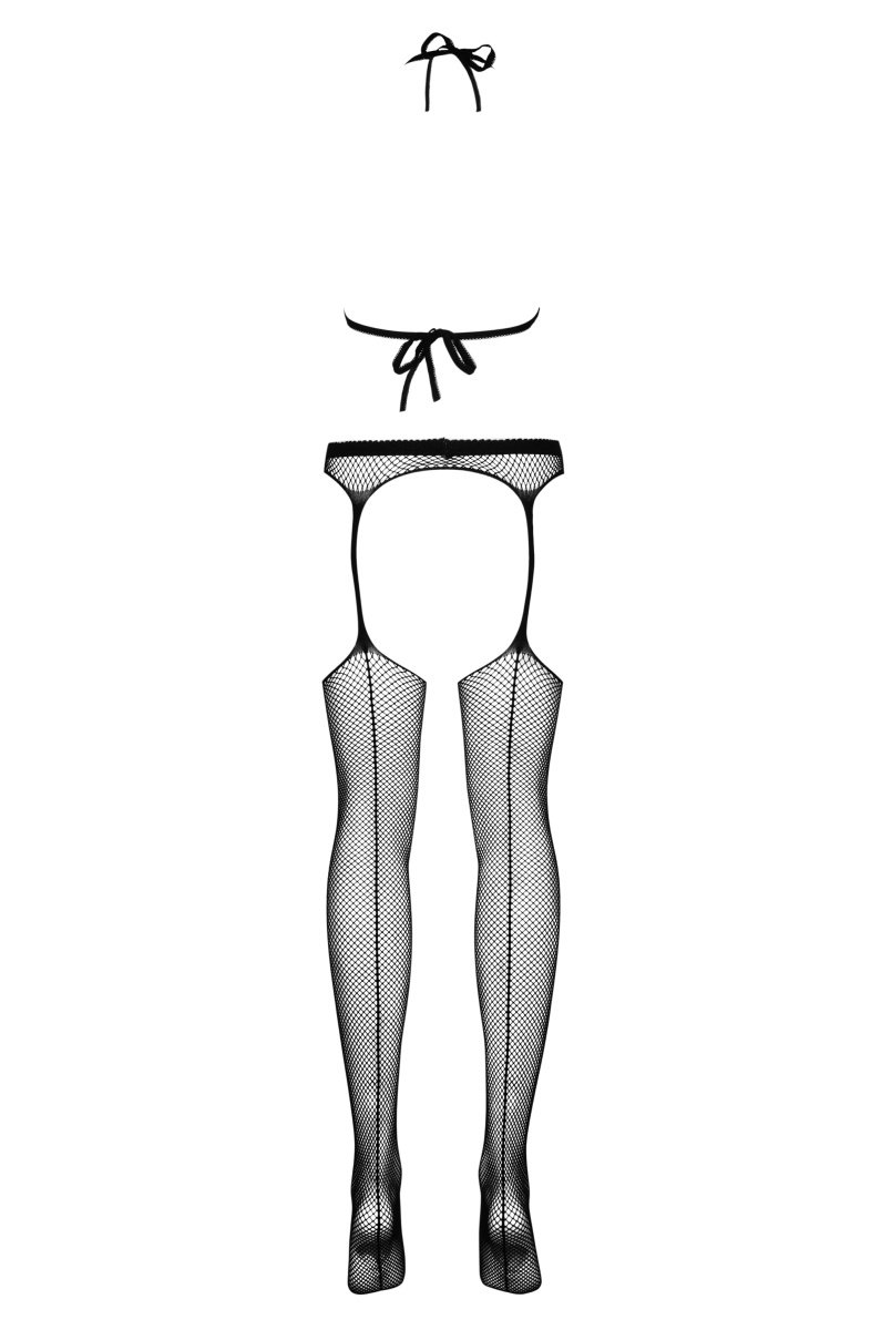 Боди-комбинезон выполнен из пикантной сеточки черного цвета. Сексуальные полосы в области животика подчеркивают фигуру.