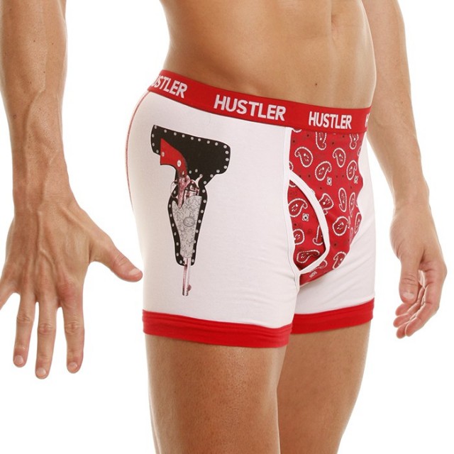Оригинальные боксеры от Hustler для настоящих ковбоев Дикого Запада. На правом бедре расположился необычный принт в виде револьвера в кобуре, а гульфик выполнен в красном цвете с орнаментом из турецких огурцов.