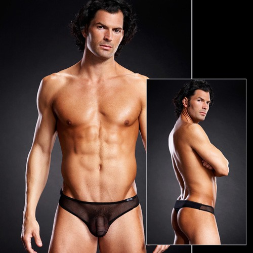 Мужские трусы G стринги из комбинированной ткани - спереди мелкая эластичная прозрачная сетка, сзади - эластичное плотное полотно черного цвета.