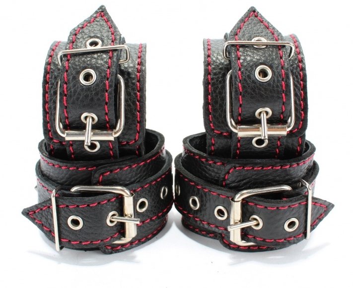 Набор для связывания состоит из наручников и оков, выполненных из натуральной черной кожи с контрастной красной строчкой, и двух бандажных ремней с карабинами.Аксессуары фиксируются на теле при помощи ремней и металлических пряжек. Наручники подойдут на обхват руки от 15 до 25 см, оковы подойдут на обхват от 16 до 27 см. Ширина оков и наручников 5 см, ширина ремешков 2,5 см.