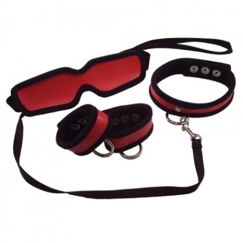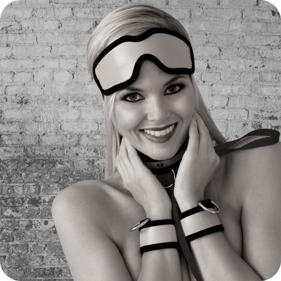 - маска на глаза, - 2 манжеты на запястья или лодыжки, - регулируемый ошейник, - поводок на удобной защелке