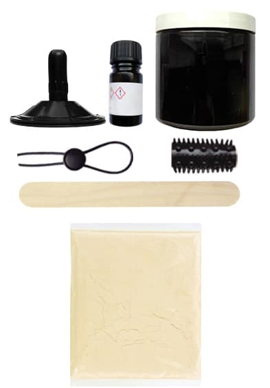 В набор входят: 2 упаковки 3D-гипса, баночка с силиконом, пузырек с затвердителем, присоска, эрекционное лассо, насадка на член, деревянная палочка и инструкция.