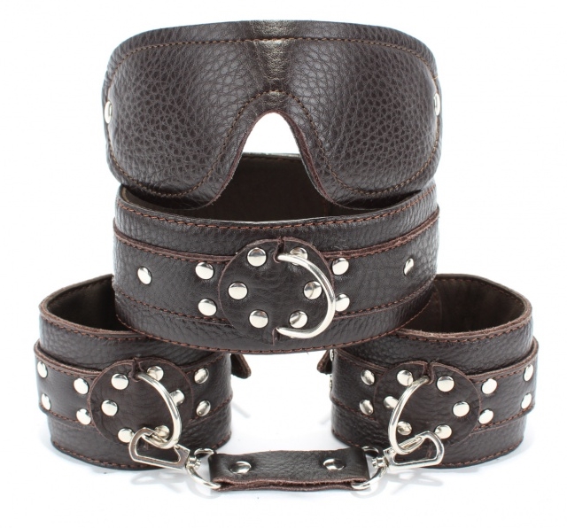 Интригующий набор из маски, ошейника, оков, выполненных из мягкой коричневой кожи, поможет окунуться во всю бездну эротических страстей!