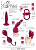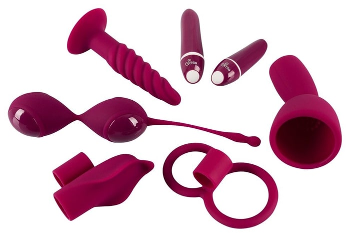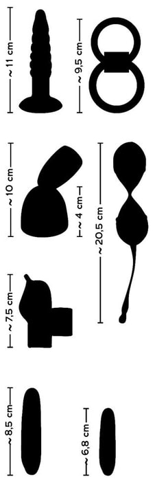 В комплект входят 2 силиконовых минивибратора с покрытием из полиуретана (6,8 х 2,1 см. и 8,6 х 2,1 см.), вагинальные шарики на гибкой сцепке массой 80 г. (20,5 х 3,7 см.), двойное эрекционное кольцо для пениса и мошонки, пальчиковый вибратор (длина 7,5 см.), насадка для вибратора (10 х 4 см.), анальная пробка со спиральной втулкой (11 х 2,5 см.).