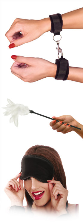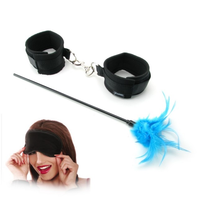 В комплекте есть загадочная маска на глаза, регулируемые по размеру наручники и тиклер из нежных перышек для поддразнивания и щекотания.